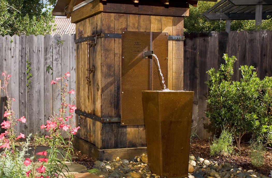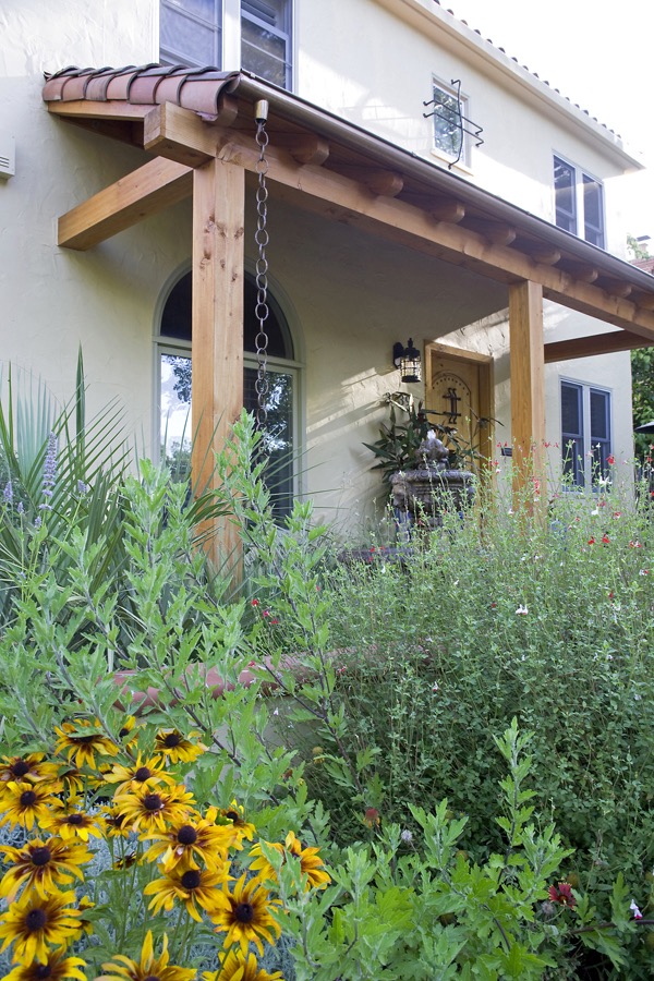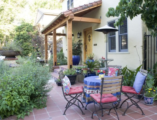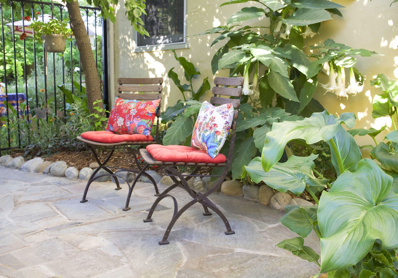 Reclaimed concrete and flagstone patio with recycled metal arbor. (featured in Sacramento Magazine)