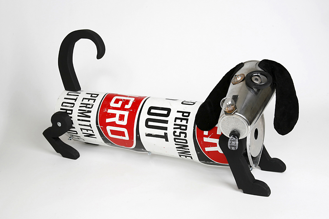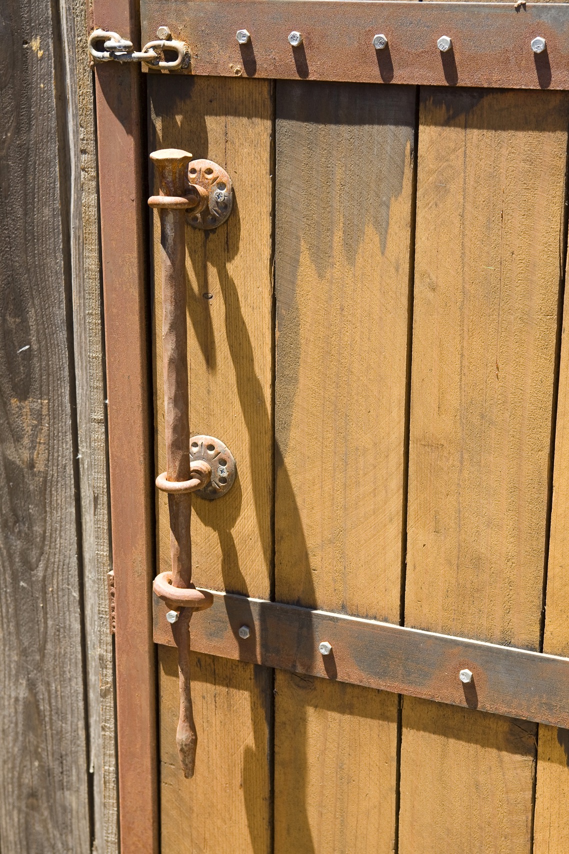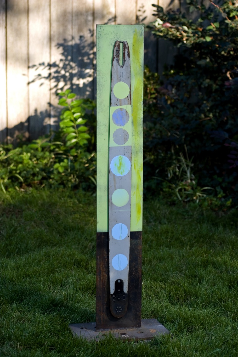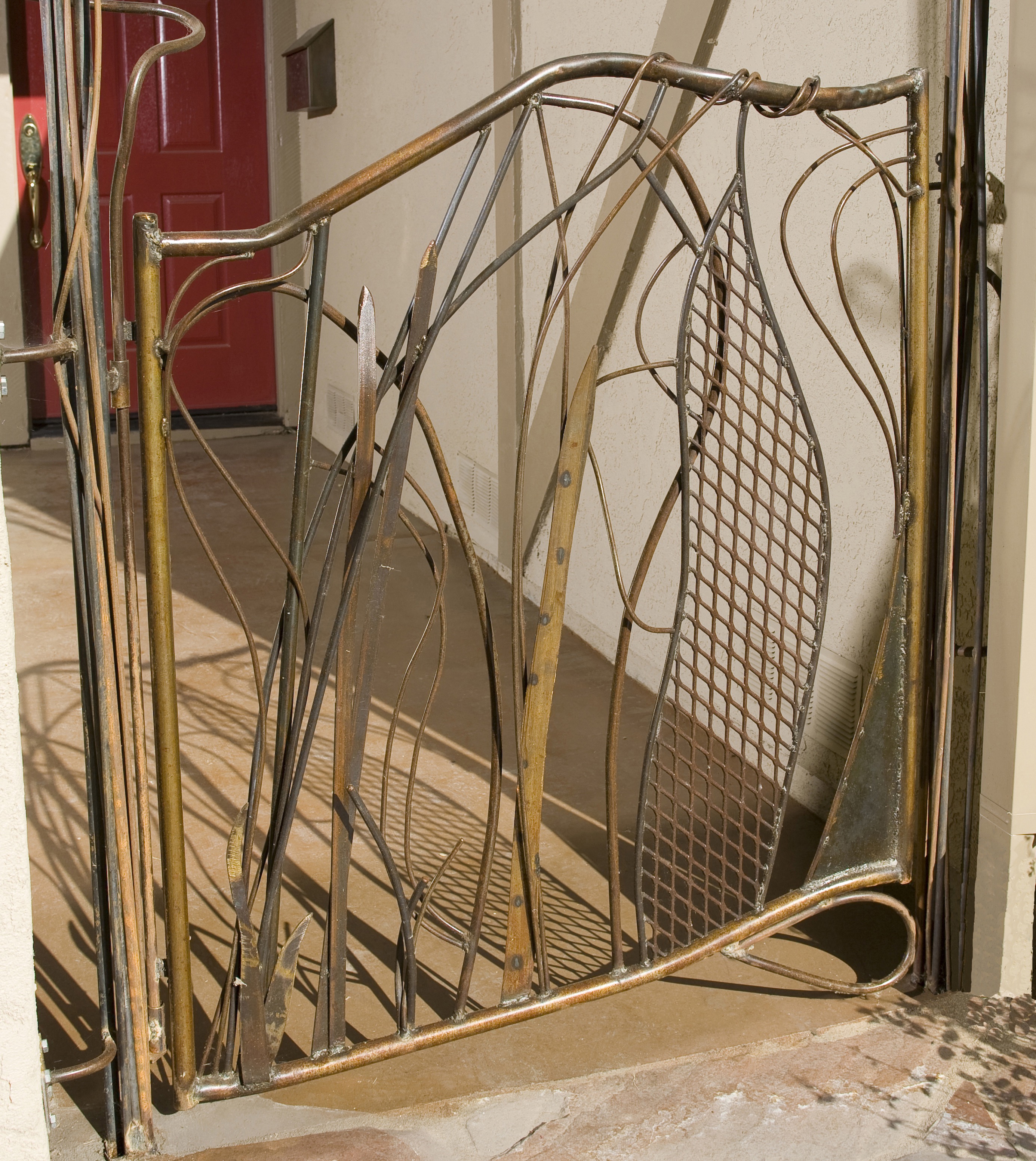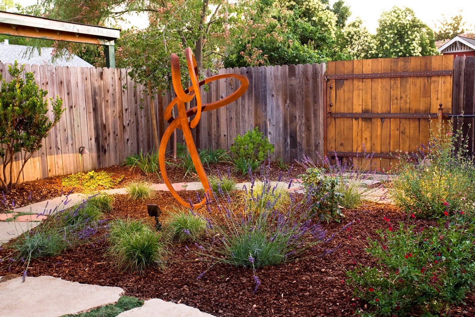The metal sculpture garden with reclaimed concrete pathway and hand made gate. (featured in Sacramento Magazine)